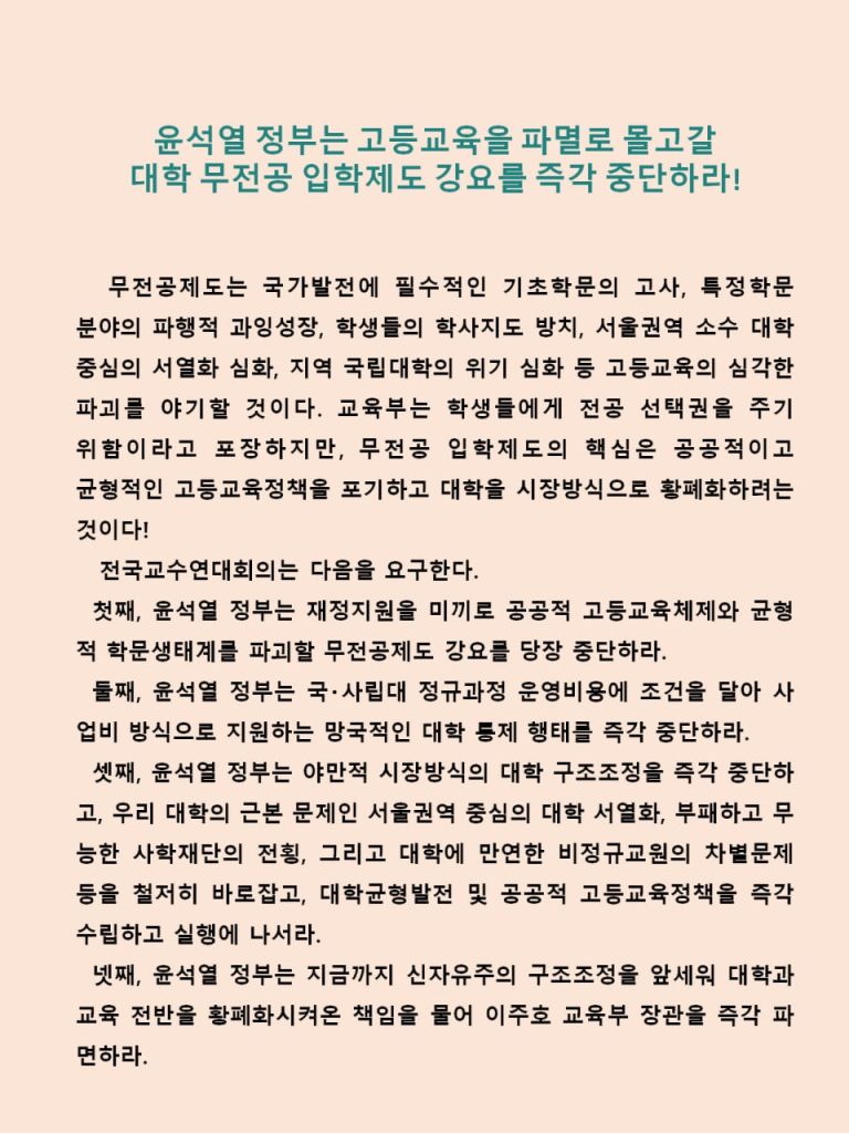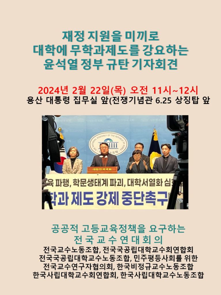 무전공·무학과 강제 중단촉구 기자회견 활동소식 연구자의집은 전국교수노동조합, 전국국공립대학교수연합회, 전국국공립대학교수노동조합 등과 함께 고등교육 파행, 학문생태계 파괴, 대학서열화를 심화할 무전공·무학과 제도 강제 중단촉구 기자회견을 진행했습니다. 202024-04-292024-04-30활동소식