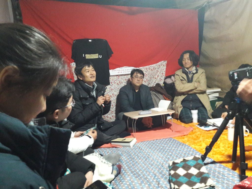 천막농성이나 노상투쟁, 이런 단어들은 스물한두살 무렵 철거민 운동 언저리를 서성였던 저한테도 사실 낯선 것은 아니었습니다. 하지만 이후 대학원 진학을 택했던 저를 포함한 몇몇은 여전히 이른바 진보의 입장에서, 정의로운 자의 위치에 스스로를 세워둔 채 글 쓰고 발언하면서도 사적 자리에서는 ‘교수야말로 3D업종이다,’ ‘교직원들이 갑이다,’ ‘요즘은 학생들의 입에 지식을 떠먹여주어야 한다’ 식의 투정을 주고받으며 부지불식간에 점차 안정된 내부로 향하고 있었는데요. 선생님은 바로 그 지점에서 내부 아닌 바깥으로, 천막으로 향하셨고 노숙투쟁을 하셨습니다. ‘길 위의 연구자’는 수사적 표현이 아닌 실제가 되었고요.