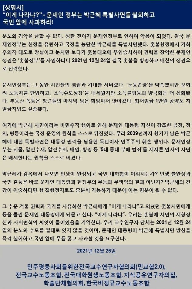 그 추운 겨울 권력과 국가를 사유화한 박근혜에게 “이게 나라냐”고 외쳤던 촛불시민에게 등을 돌린 문재인 대통령에게 되묻고 싶다. “이게 나라냐”. 우리는 촛불에 시민의 저항정신과 사회변혁의 씨앗이 들어있음을 기억한다. 우리 교수연구자 단체는 2021년 12월 24일의 분노와 수모를 절대로 잊지 않을 것이며, 문재인 대통령이 박근혜 특별사면 방침을 즉각 철회하고 국민 앞에 무릎 꿇고 사과할 것을 요구한다.