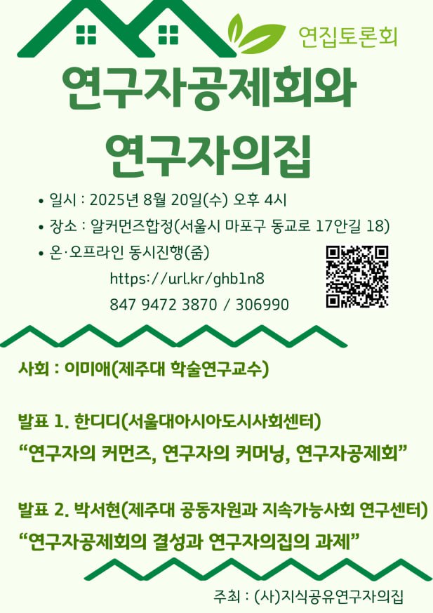 2025년 8월 20일(수) 오후 4시 연구자의집은 2022년 12월 이후 연구자들의 교류와 소통, 그리고 지식공유를 위한 오프라인 플랫폼으로 역할을 해 왔던 R커먼즈의 마지막 행사로 토론회를 개최했습니다.
