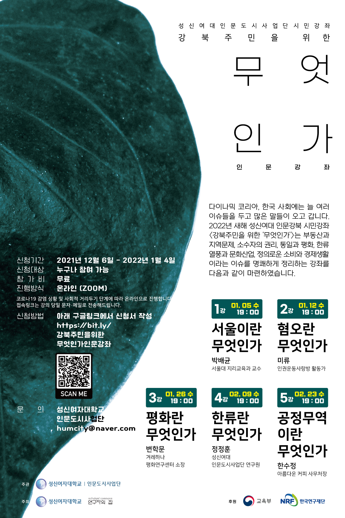 성신여대 인문도시사업단 인문강좌 ’무엇인가‘가 진행 중입니다. 본 강좌는 부동산과 지역문제, 소수자의 권리, 통일과 평화, 한류열풍과 문화산업, 정의로운 소비와 경제생활이라는 한국사회의 다양한 이슈를 명쾌하게 정리하고 이에 대해 시민과 함께 논의하기 위해 기획되었습니다.