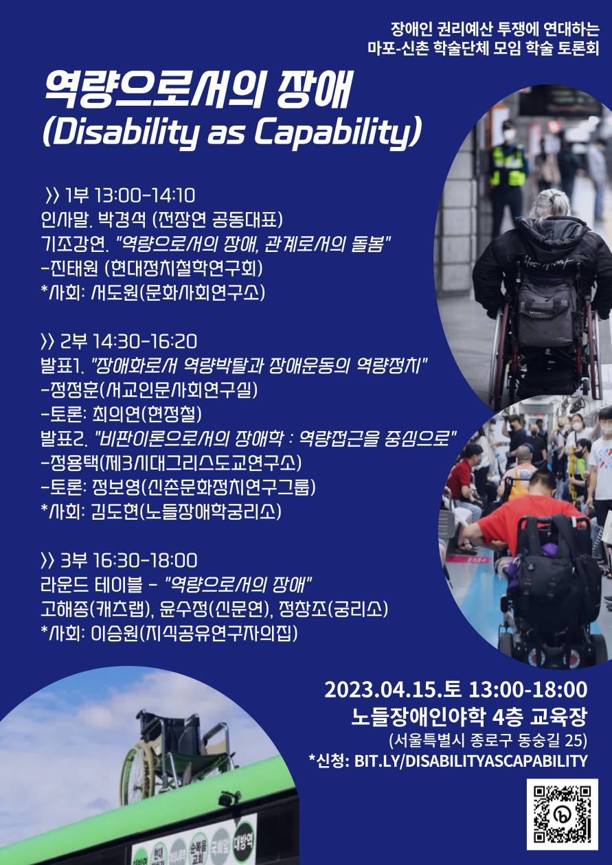 지금 전국장애인차별철폐연대는 실효성 있는 장애인권리예산 편성을 주장하며 투쟁 중에 있습니다. 이 투쟁이 시작되던 작년 말과 올해 겨울 그리고 바로 이 순간도, 정부와 여당 그리고 서울시는 장애인들의 절박한 투쟁을 범죄화하고 민폐로 만들면서 억압하고자 합니다. 하지만 평등과 해방을 향한 장애인의 투쟁은 멈추지 않고 지금까지 이어지고 있습니다. 마포와 신촌 지역 일대에서 독립적 학술활동을 하는 우리는 장애인 투쟁에 연대하며 “역량으로서의 장애”라는 주제로 다음과 같이 학술 토론회를 개최합니다. 많은 분들의 참여를 바랍니다.