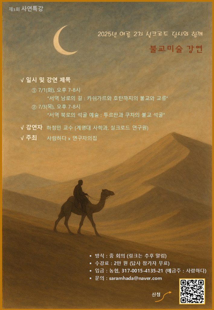 제3회 사연특강 활동소식 연구자의집에서는 사람하다와 함께 제3회 사연특강을 개최했습니다. 7월 1일과 3일 양일에 걸쳐 이루어진 본 특강의 주제는 각각 “서역 남로의 길: 카쉬가르와 호탄까지의 불교와 교류” (7월 1일), “서역 북로의 석굴 예술: 투르판과 쿠차의 불교 석굴”(7월 3일)이었습니다. 연구자의집은 작년에 이어 2차 실크로드 답사를 신장 지역에서 진행합니다. 132025-07-312025-07-31활동소식