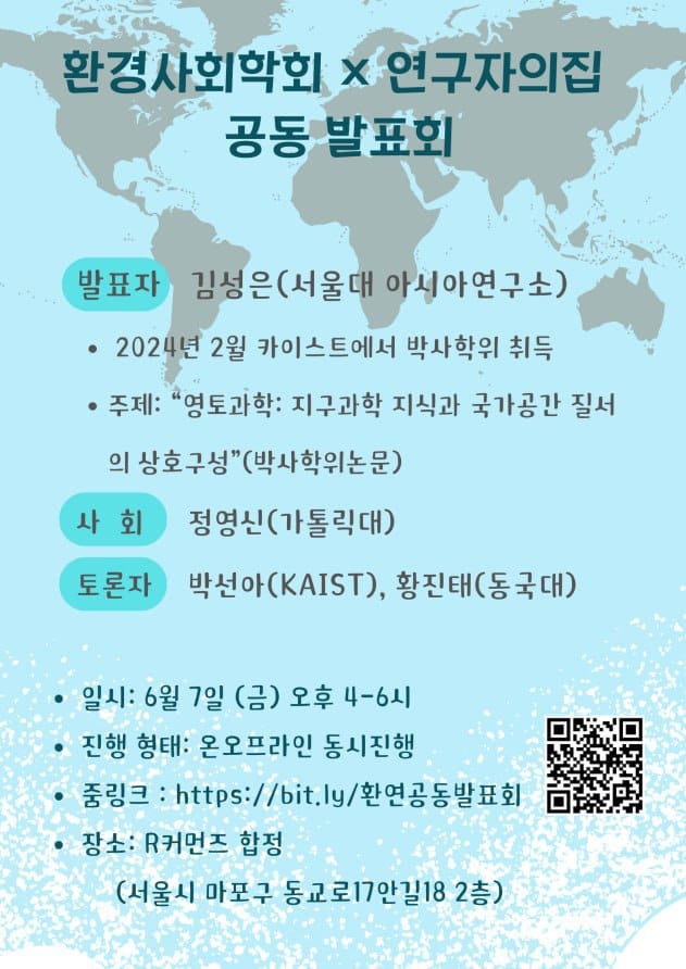 지난 6월 7일, 환경사회학회와 연구자의집이 공동으로 발표회를 가졌다. 연사인 김성은 박사는 지난 2월 카이스트에서 박사학위를 받았고, 이번 발표회에서는 박사학위 내용을 토대로 “영토과학: 지구과학 지식과 국가공간 질서의 상호구성”이라는 제목의 발표가 논의되었다. 토론자로는 카이스트의 박선아 연구원과 동국대학교 황진태 교수가 참여하였다.