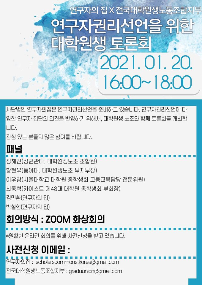 20210120 토론회 개최 <1차 연구자권리선언을 위한 토론회: 연구자의 집 X 전국대학원생노동조합지부> 활동소식 사단법인 연구자의집은 연구자권리선언을 준비하고 있습니다. 연구자권리선언에 다양한 연구자 집단의 의견을 반영하기 위해서, 대학원생 노조와 함께 토론회를 개최합니다. 관심 있는 분들의 많은 참여를 바랍니다. 352021-01-102023-10-12활동소식