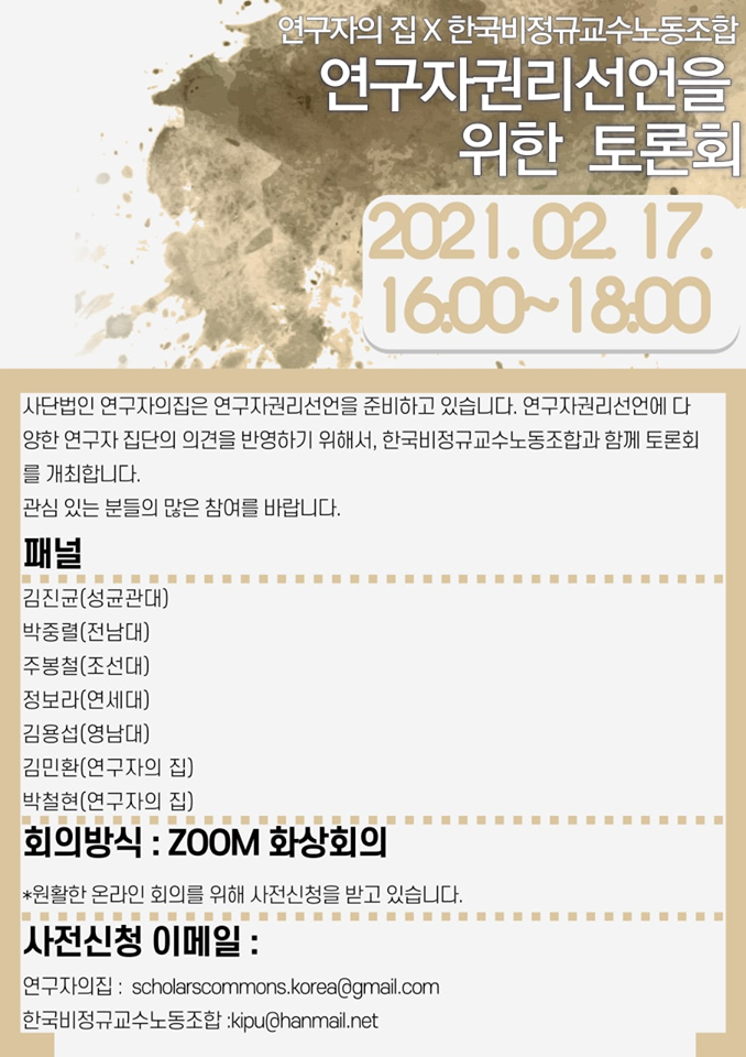 20210217 토론회 개최 <2차 연구자권리선언을 위한 토론회: 연구자의 집 X 한국비정규교수노동조합> 활동소식 “연구자 권리선언” 준비를 위한 2번째 토론회를 비정규교수노조와 같이 오는 2월 17일(수) 오후 4시에 온라인으로 개최합니다. 많은 관심 부탁드립니다. 352021-02-092023-10-12활동소식