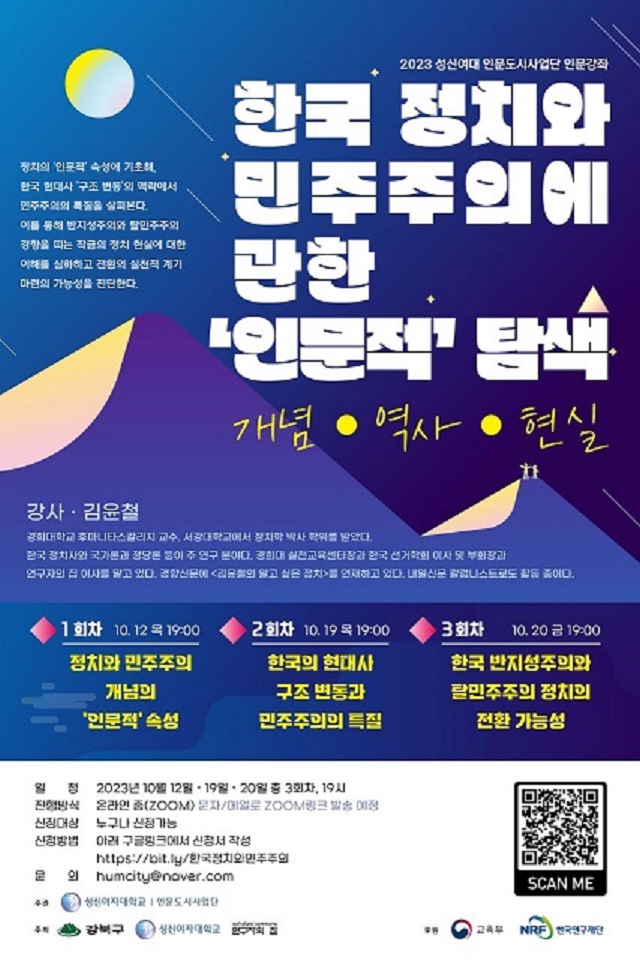 연구자의집에서는 성신여자대학교와 함께 2023 성신여대 인문도시사업단 인문강좌 한국 정치와 민주주의에 관한 ‘인문적’ 탐색 강좌를 진행했습니다. 김윤철 경희대학교 후마니타크칼리지 교수의 세 강의 ‘정치와 민주주의 개념의 ‘인문적’ 속성'(1강), ‘한국의 현대사 구조 변동과 민주주의의 특질'(2강), ‘한국 반지성주의와 탈민주주의 정치의 전환 가능성'(3강)으로 진행된 본 강좌는 정치의 ‘인문적’ 속성에 입각해 한국 현대사 ‘구조 변동’의 맥락에서 민주주의의 특징을 살펴본 시간이었습니다.