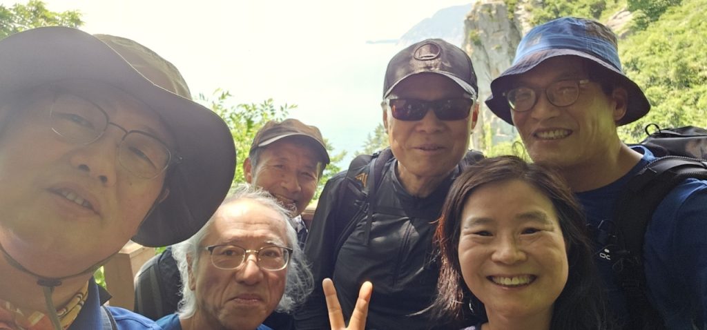 길을 따라 오른쪽엔 바다가 계속 보였다. 등산로는 해안가를 따라 둘러서 길이 나 있었고, 그 길을 둘러서 가는 동안 계속 오른쪽에 바다가 보이면서 올라가는 모양으로 형성되었다. 마치 변증법적 유물론에서 나선형의 발전이 이루어지는 것처럼 올라가는 길이 멋있었다. 길 옆에는 대나무 숲, 동백나무, 사철나무 등으로 빽빽하게 나무가 들어서 있어 거의 햇볕이 보이지 않을 정도로 어두운 숲길이 이어졌다. 사람들은 마치 구도자처럼 한 줄로 오솔길을 따라 산 위로 올라가고 있었다.