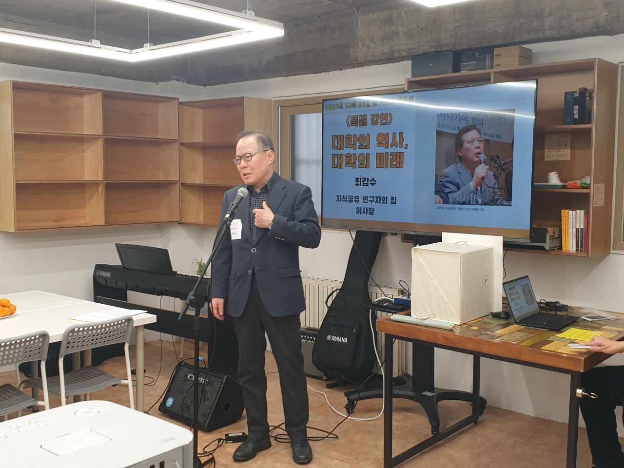 안녕하십니까. 지식공유 연구자의 집에서 마련한 R커먼즈합정 개소 특강 ‘대학의 역사, 대학의 미래’의 강연을 맡은 최갑수입니다. 먼저 제 경험을 소개하는 것에서부터 오늘 특강을 시작하겠습니다. 제가 서울대학교 법인화 반대 운동을 했고, 교수노조 준비위원장을 했습니다. 1999년도에 민교협 의장을 하면서 교수노조 추진단을 만들었습니다. 2001년도 당시 정부는 교수노조가 불법이라고 했는데요, 우리는 비법이지만 비헌법적이지는 않다는 점에서 헌법노조라고 했습니다. 이렇게 교수노조를 만들었고 결국 최근 합법화됐습니다.
